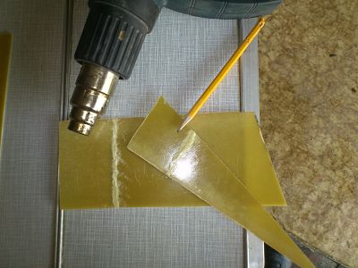 В интернете по этому поводу есть всего много написанного. Из всего написанного можно выделить два положения как же сделать в домашних условиях этот злополучный угол. Первый вариант, как описывали... нужно нагреть строительным феном и у вас получиться том самый угол. По своему опыту могу сказать лишь одно - НЕ ВЕРЬТЕ этому способу. Так как я несколько раз пытался нагревать как медленным способом так и быстрым, но увы, ничего хорошего из этого не получилось. На фото несколько сфотканых попыток нагрева, не стал все попытки фоткать. Так что способ прогрева не прокатывает. Если, конечно же у вас не заводское какое нибудь оборудование для изгиба стеклотекстолита. Думаю самым оптимальным способом будет расслоение всего стеклотекстолита в части, где собираетесь сделать угол и проклейкой его с помощью эпоксидного клея в определенном угле.